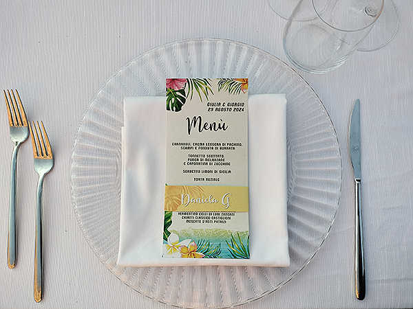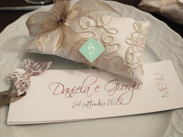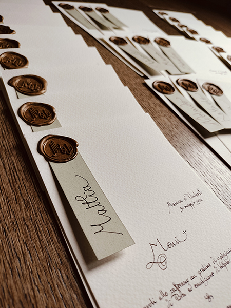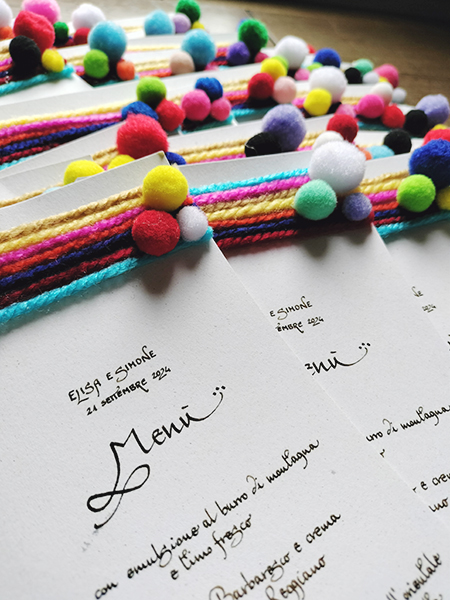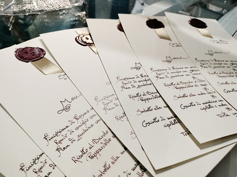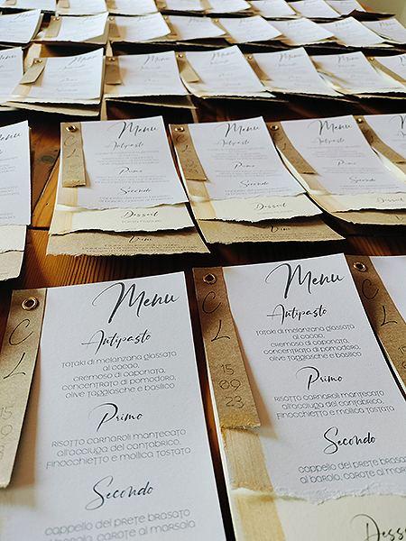Realizziamo menù unici e raffinati, pensati in perfetta armonia con lo stile e l’atmosfera dell’evento, per trasformare ogni tavola in un’esperienza elegante e memorabile. Ogni creazione nasce dalla nostra capacità di interpretare i desideri degli sposi e di tradurli in soluzioni originali e personalizzate: manoscritti, stampati o decorati, tutti realizzati rigorosamente a mano, con cura artigianale e attenzione ai dettagli. Ogni menù diventa così non solo un accessorio, ma un piccolo capolavoro che racconta la storia dell’evento e ne esalta l’unicità.